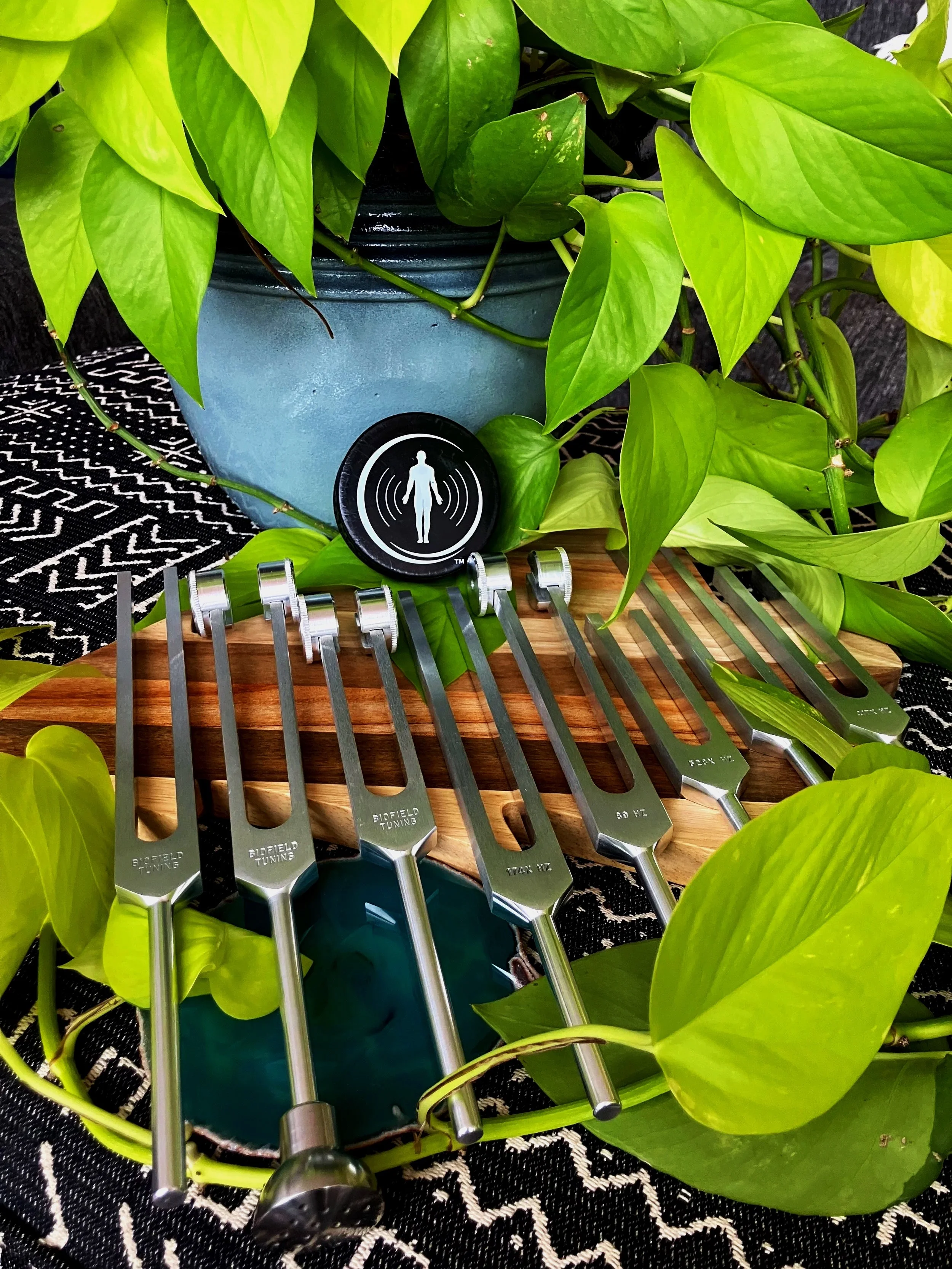 The tuning forks are used like sonar to find and resonate with areas of dissonance or distortion in the body. Emotions and trauma can become stuck in and around our bodies as patterns of tension and resistance that can be heard audibly by bouncing sound off the body and listening to the unique frequency signature of each emotion or pathology. The tuning forks are able to reflect that sound back to the body like a mirror. The tuning fork then provides a stronger, more coherent frequency for the body to entrain to for a more harmonious expression, almost like it is autotuning itself.